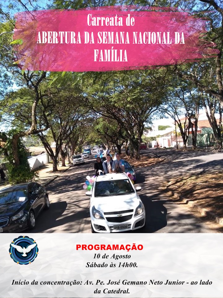 No próximo sábado, dia 10 de agosto, o Decanato Catedral promoverá uma carreata pelas principais ruas de nossa cidade para dar início à pré-abertura da Semana Nacional da Família. A concentração será a partir das 14h, ao lado da Paróquia Catedral do Divino Espírito Santo.