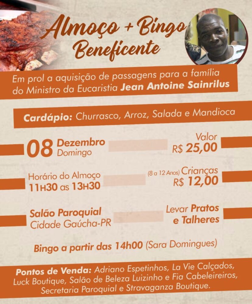 Um dos seus maiores sonhos é trazer sua família para o Brasil, para que possam viver juntos, felizes e desta forma buscarem uma vida mais digna. Por essa razão a comunidade e a paróquia de Cidade Gaúcha estão promovendo um almoço e um bingo beneficente para ajudar o amigo Jean na aquisição das passagens para seus filhos e esposa, pois ele merece.