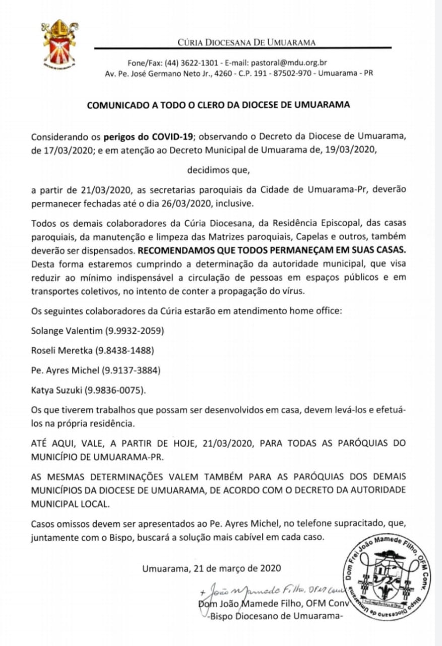 Bispo emite comunicado ao Clero da Diocese de Umuarama