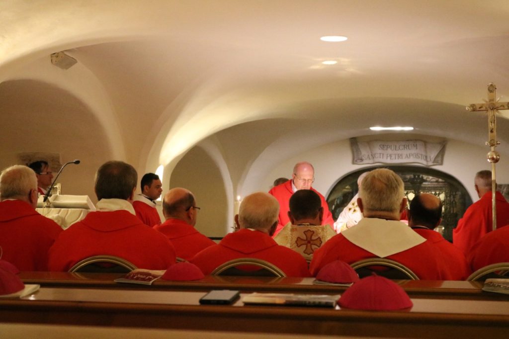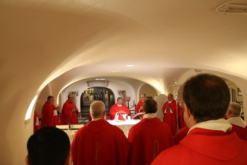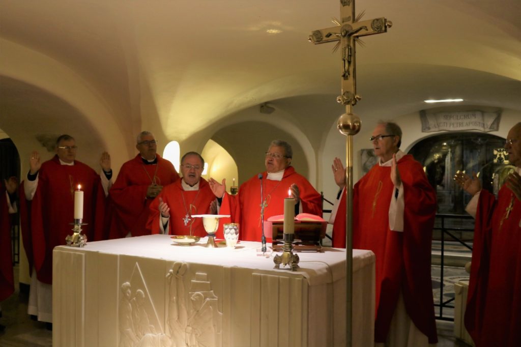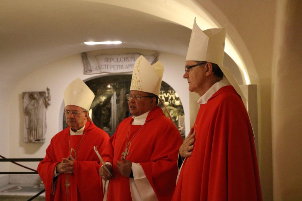 A Visita Ad Limina Apostolorum do episcopado paranaense entrou na segunda semana de atividades, com o compromisso mais esperado pelos bispos: a audiência com o Santo Padre, o Papa Francisco. No início da manhã dessa segunda-feira, 24 de fevereiro, os bispos celebraram a missa na cripta da Basílica de São Pedro, junto ao túmulo do Apóstolo. Dom Antônio Wagner da Silva, bispo de Guarapuava, foi o presidente da celebração, ladeado por Dom Bruno Elizeu Versari, bispo de Campo Mourão, e Dom João Mamede Filho, bispo de Umuarama.