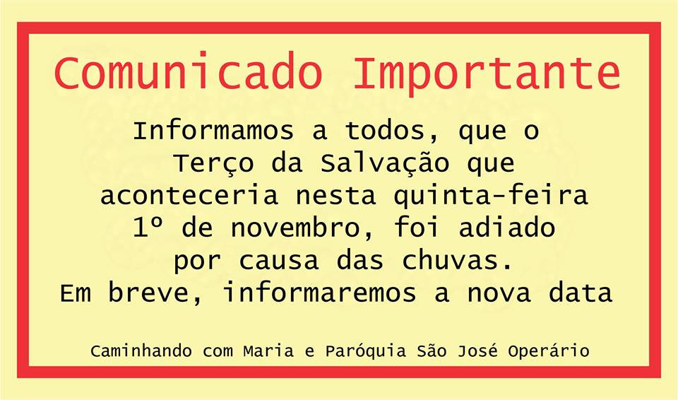 O grupo Caminhando com Maria e a Paróquia São José Operário cancelaram o Terço da Salvação que aconteceria hoje, 1° de novembro, devido às condições climáticas.