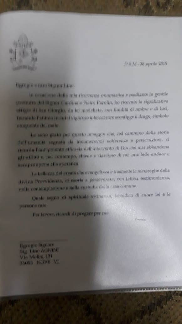 Inclusive, sobre o Papa Francisco, aconteceu uma feliz coincidência. O Sr. Lino Agnini havia doado uma escultura da imagem de São Jorge para o referido Papa. E este decidiu enviar para busca-la, com uma carta de agradecimentos, o seu secretário direto, ou seja, o EXmo. Cardeal Pietro Parollin. Ao chegar na fábrica, o Sr. Lino deu o presente e pediu ao Cardeal que desse uma bênção à cruz que já estava para ser enviada ao Brasil, o que fez de imediato. O Sr. Lino, recebendo a notícia de que a cruz, após quase cinco meses para ser liberada pela Receita Federal, assim respondeu: Enfim! O “Cristo” foi abençoado pelo Secretário de Estado: o Cardeal Peter Parolin. Foi aberto? Saudações e até breve.