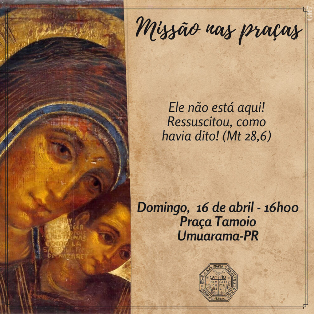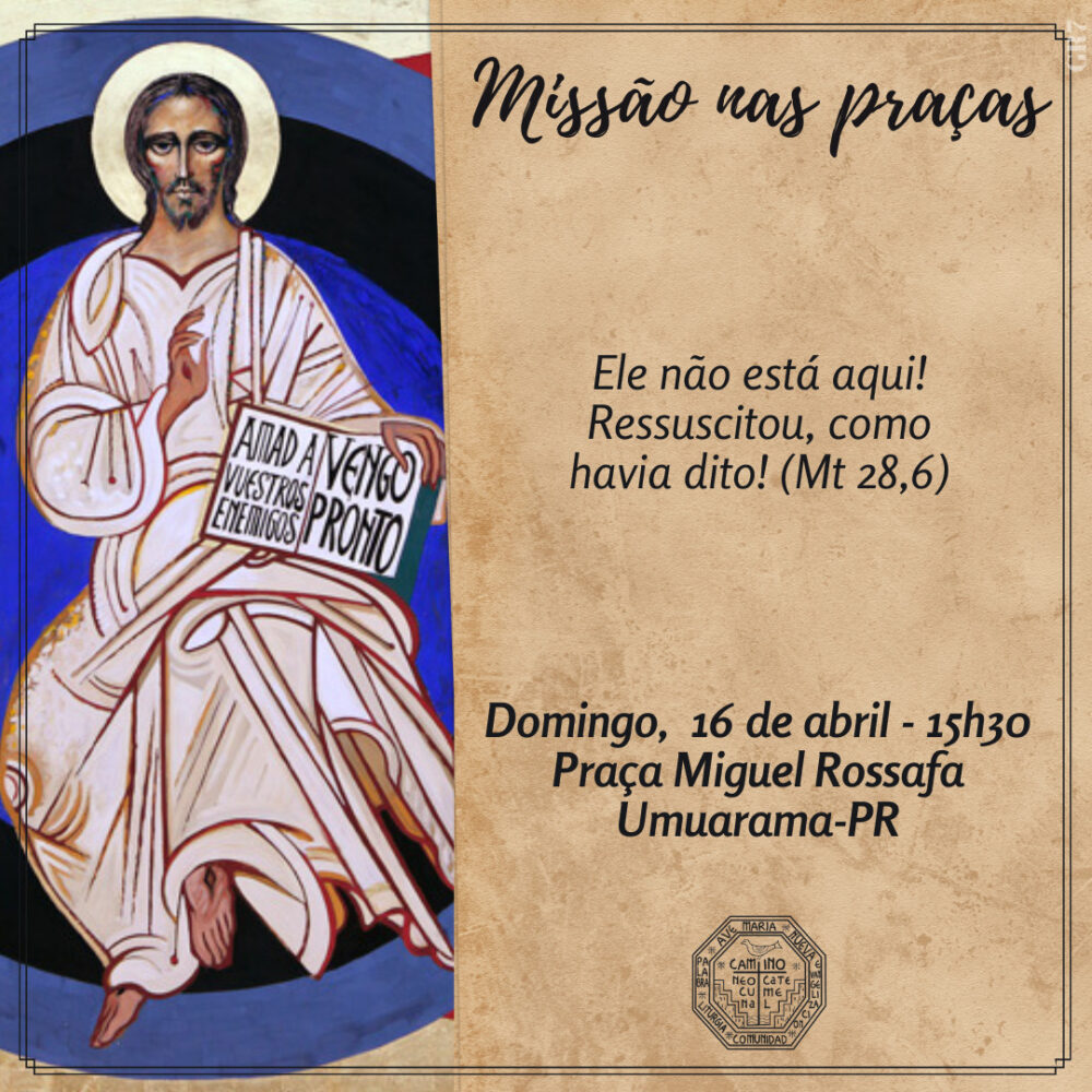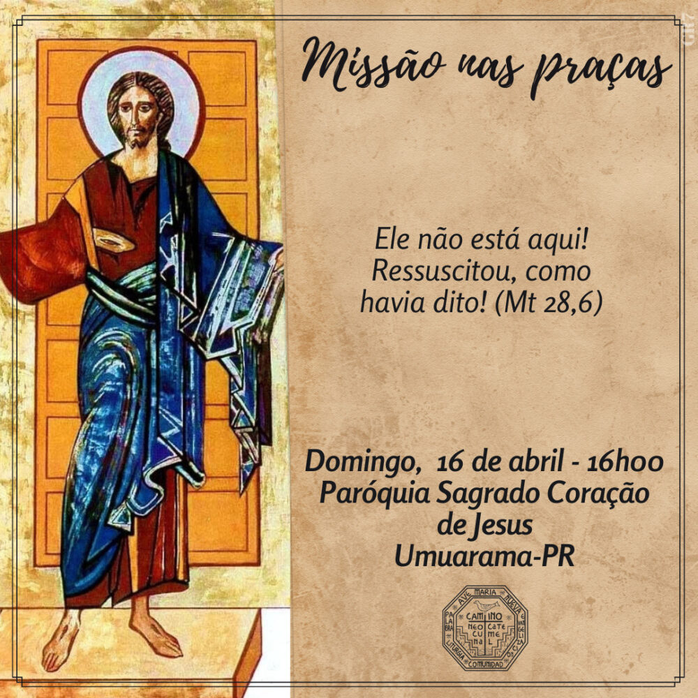 No próximo domingo (16), às 16h, as Comunidades Neocatecumenais de Umuarama realizarão a Missão nas Praças. Este ano, a missão acontecerá nas praças Miguel Rossafa, Tamoio e na frente da Paróquia Sagrado Coração de Jesus, no Jardim Belvedere. As missões começaram em 2013, a pedido do Papa Francisco, para que os fiéis católicos fizessem uma Igreja em saída, levando a Palavra de Deus aos mais necessitados.