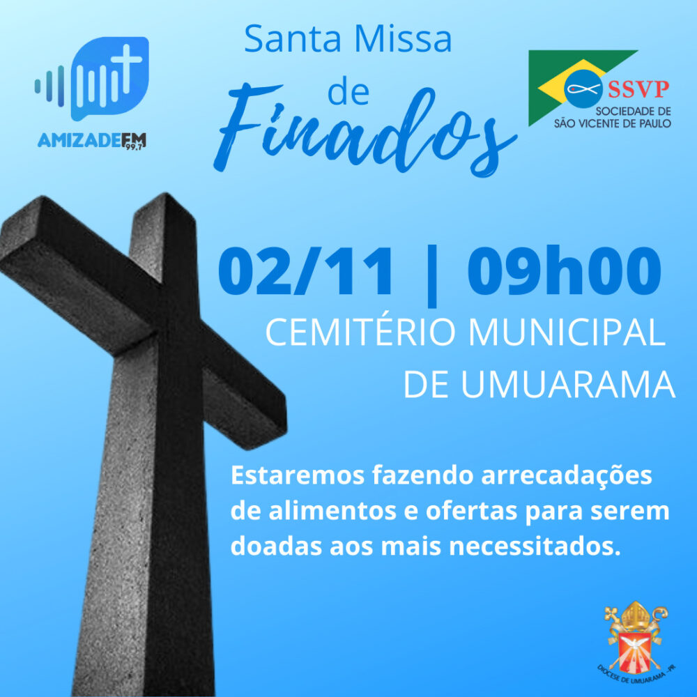 O Bispo Dom Frei João Mamede Filho, OFM Conv., irá presidir a Santa Missa solene às 08h na Paróquia Catedral do Divino Espírito Santo, que terá transmissão também pela TV UP. Já no cemitério, será realizada uma missa às 09 horas, organizada pela Rádio Amizade e pelos Vicentinos, onde estarão durante o dia inteiro, recebendo doações e ofertas pelos menos favorecidos da cidade.