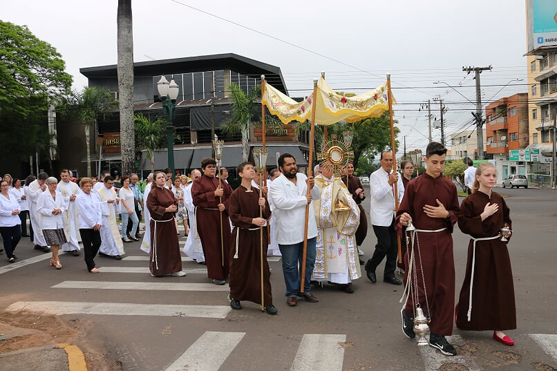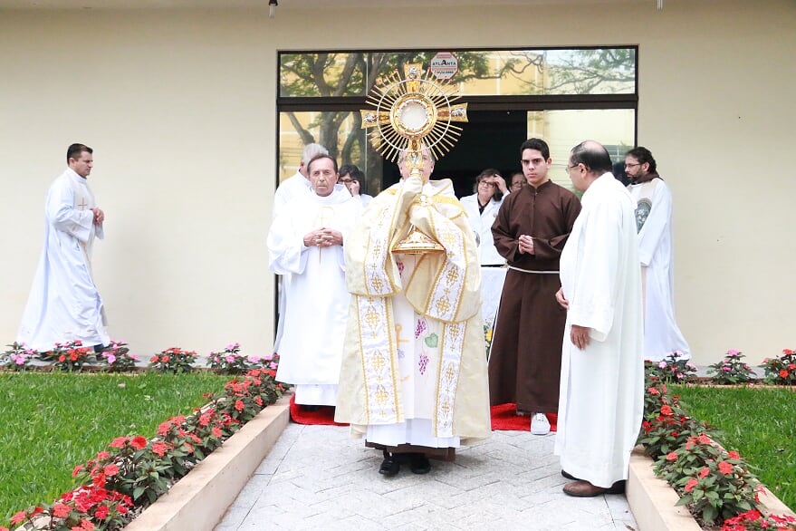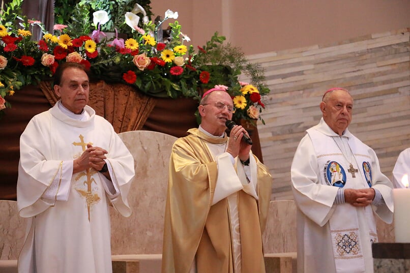 No início, a emocionante procissão com o Santíssimo Sacramento da casa paroquial até o altar da Matriz, relembrando aquele gesto dos idos anos de 1968 quando ocorreu a transladação do Santíssimo da antiga igreja de madeira até a nova Matriz. Assim como a novena, também a missa festiva foi muito participativa e contou com as honrosas presenças do Bispo Diocesano Dom Mamede e de nosso Bispo Emérito Dom José Maria Maimone, além de diversos padres diocesanos e freis de outras cidades.