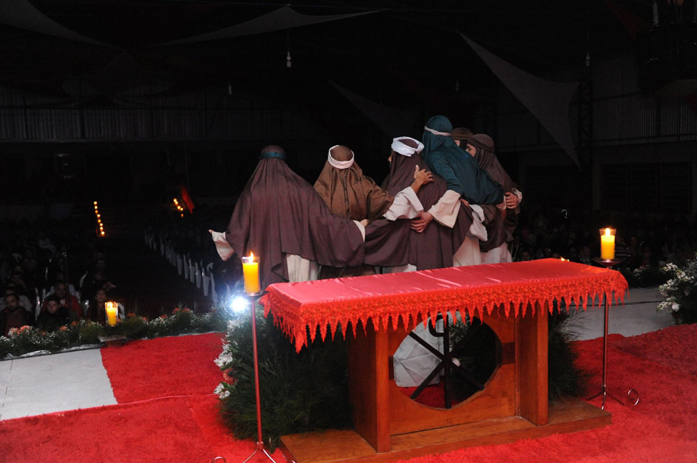 Além do ambiente todo ornamentado em vermelho, marcado com os sete dons do Espírito Santo, a Santa Missa contou também com a encenação da descida do Espírito Santo sobre Maria e os apóstolos.