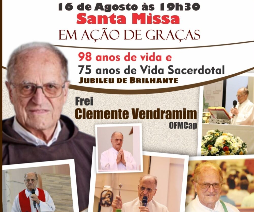 A santa celebração festiva será em Ação de Graças pelos seus 75 anos de vida sacerdotal e 98 anos de idade do Frei Clemente Vendramim e celebrada hoje (16) na Paróquia São Francisco de Assis em Umuarama. Quem não puder estar presente poderá acompanhar a celebração pelo facebook e youtube da Diocese e da Paróquia.